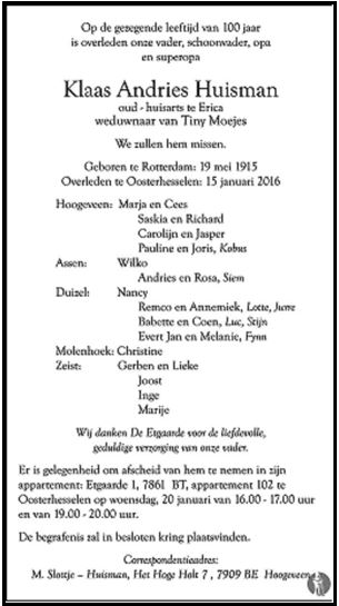 Klaas Andries Huisman, huisarts, geb. Rotterdam 19-05-1915, overl. Oosterhesselen, Drenthe 15-01-2016, oud 100 jaar, tr. Oudorp, Alkmaar op 02-05-1946 met Trijntje Moejes, geb. Oudorp 20-10-1919, overleden, dr. van Willem Moejes en Jacoba van Bodegraven