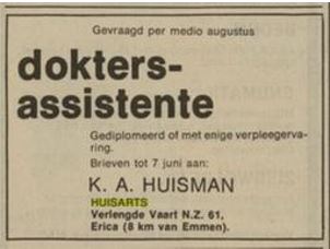 In 1946 nam Klaas Andries Huisman de huisartsenpraktijk met apotheek over van Abraham Jan Dingeman Stukje, de eerste huisarts te Erica.