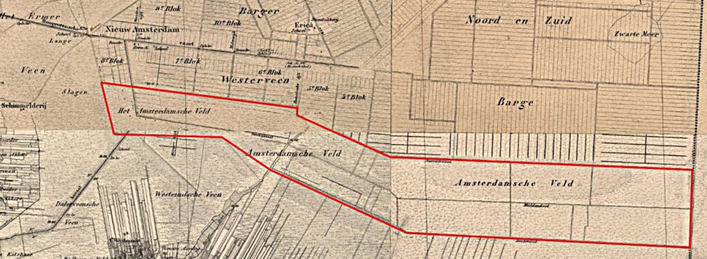 Het laatste veengebied binnen de gemeente Emmen is het Amsterdamscheveld, een strook veen van 2.256 ha, zich uitstrekkend langs de gehele zuidgrens van de gemeente Emmen, van de grens met Sleen in het westen tot aan de grens met het koninkrijk Hannover in het oosten. Aan de zuidzijde lagen de Schoonebeker venen.